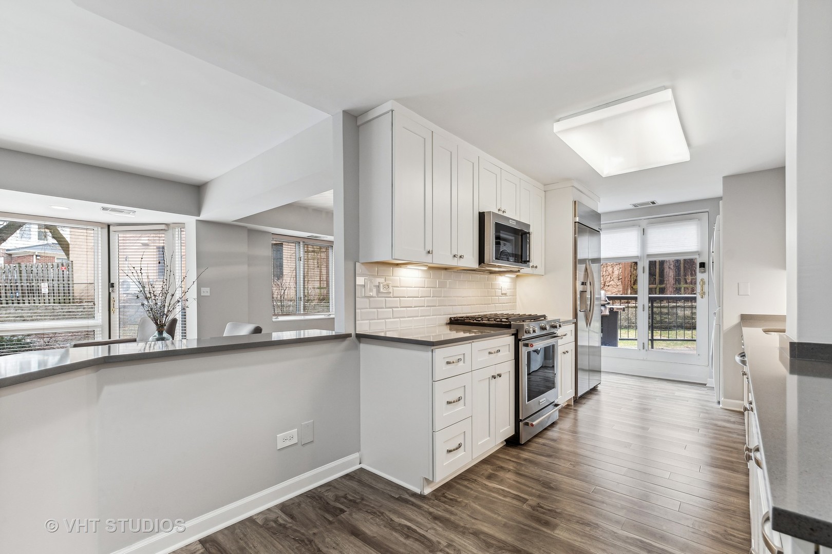 Recently renovated 2-bedroom, 2-bathroom West facing end unit in the sought-after Terraces of Mulberry. Newly updated white kitchen featuring quartz counters, a subway tile backsplash, and stainless steel appliances, creating a modern and inviting space. The kitchen seamlessly opens to the family room, with newer wood laminate flooring and floor-to-ceiling windows providing tons of natural light. Large Primary Suite complete with walk-in closet and spacious bath with double vanity, separate shower and soaking tub. The second bedroom also offers good storage and an ensuite bath. Step outside on the private patio accessed through the kitchen. Newer in unit washer and dryer and includes an underground parking spot. Conveniently located near town and train!