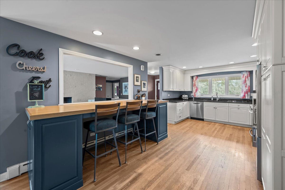 Welcome home to this light-filled custom ranch tucked away in a private setting. A welcoming foyer opens to a spacious living room with a cozy wood-burning fireplace. The kitchen features white cabinetry, stainless steel appliances, and a custom island/table that overlooks the living room - perfect for everyday living and entertaining. The dining area flows seamlessly from the kitchen, creating an easy, open layout. The home offers three bedrooms plus a primary suite with a private en suite bath. The finished basement adds valuable living space with a new full bath, rec room, laundry area, and abundant storage. Step outside to your own backyard oasis - complete with a screened-in porch, expansive patio with fire pit, and a pool for summer enjoyment. A two-car garage and private drive complete the package. All of this in a prime location close to vibrant downtown Highwood - you won't want to miss this one.